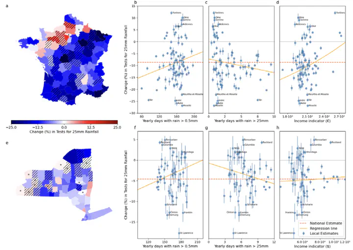 Extreme weather events can disrupt human behavior and access to health services, possibly affecting the surveillance of respiratory epidemics. Rainfall, in particular, can reduce the uptake of diagnostic testing, delay the detection of infections, and amplify the disadvantages faced by vulnerable populations. We examined this effect using the COVID-19 pandemic as a case study, analyzing daily testing activity in mainland France and New York State between May 15, 2020, and November 1, 2021. COVID-19 testing data were combined with daily rainfall and local socioeconomic indicators. Epidemic trends and weekly seasonality were extracted using time series modeling and incorporated into Poisson regression models to quantify the impact of rainfall on testing rates and to explore its variation with local rainfall profiles and income levels. Rainfall was consistently associated with reduced testing in both France and New York State. Nationally, 25 millimeters of rainfall in one day were linked to an 8-to-9 percent reduction in testing in France and around a 5 percent reduction in New York State. Spatial patterns revealed that decreases were more pronounced in poorer areas, while locations accustomed to frequent light rainfall showed weaker effects. These findings, across diverse geographies and climates, show that rainfall can hinder respiratory epidemic surveillance by reducing testing, and compounds socioeconomic and climatic vulnerabilities. Recognizing and mitigating weather-driven disruptions is essential to strengthen epidemic surveillance and maintain timely detection under a changing climate.